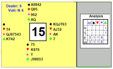 made on the nose but N-S felt damaged and called the TD. The TD was told that West acted on the misinformation given, which was unauthorised information (UI) to her. The TD would rule later as there was no time left, being a pairs event and a move was being called. We scored it as 5D= in the meantime...